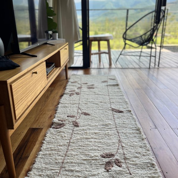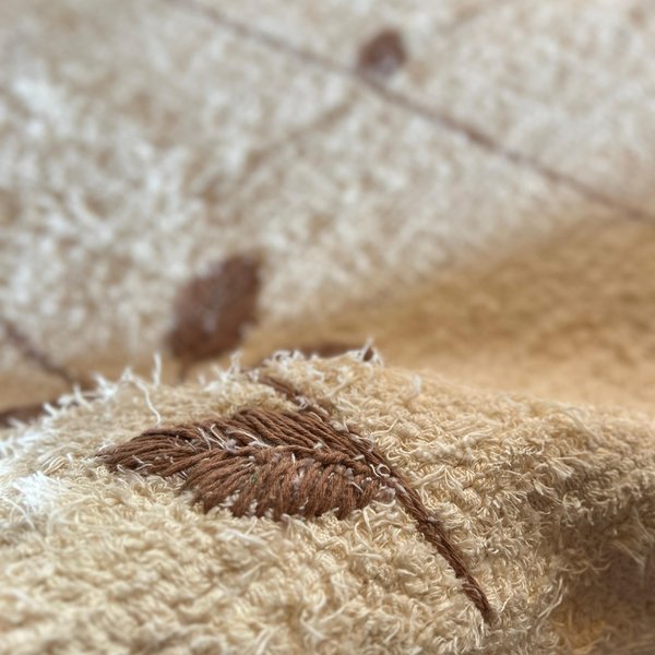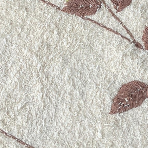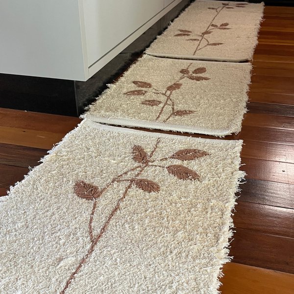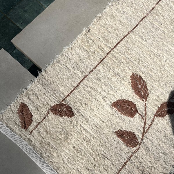 O bordado da Coleção Nature foi desenvolvido com muito cuidado e carinho, com desenho autoral e acabamento artesanal, garantindo um visual único e sofisticado. Cada tapete carrega pequenas variações naturais do processo manual, reforçando sua originalidade e o valor do feito à mão.